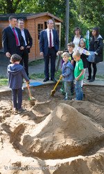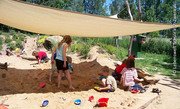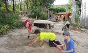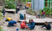 Auch an der Stephen-Hawking-Schule in Neckargemünd bildet der Hang die eine Seite des Sandkastens. Der Sand ist hier einen halben Meter tief und groß genug für viele Schüler gleichzeitig. Zum Weg hin ist die Höhe der Umrandung so gewählt, dass auch Kinder mit Rollstuhl an den Sand herankommen oder - wenn sie können - gut hinüberklettern können.