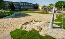 Wasser war ein viel gewünschstes Schulhofelement, und nun freuen sich die SchülerInnen über ihren neuen Wasserspielplatz: Begrenzt von einem Spielhügel versorgen eine Pumpe und ein Mosaik-Walfisch den Bachlauf und Matsch-Platz mit dem heiß ersehnten Naß.