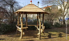 Die Jugendlichen der 7. bis 10. Klassen haben nun eigenen eigenen Sekundarstufen-Bereich. In einem kleinen Gartengelände haben sie sich unter Anleitung einer pädagogisch versierten Fachfirma eine Lümmelbank und einen Pavilion gebaut. Die Mühen beim Schälen und zusammenfügen der Robinienstämme hat sich gelohnt!